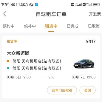 有事来四川遂宁,在成都天府机场租了个迈腾330,租金居然只要130一