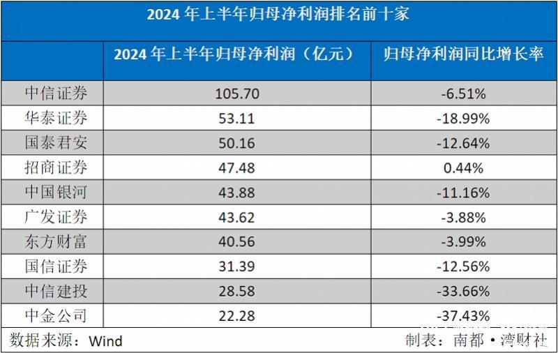 2024年上半年,归母净利润超过10亿元的还有14家,包括招商证券、中国银河、广发证券、东方财富、国信证券、中信建投、中金公司、申万宏源、东方证券、光大证券、方正证券、国投资本、东吴证券、国元证券。