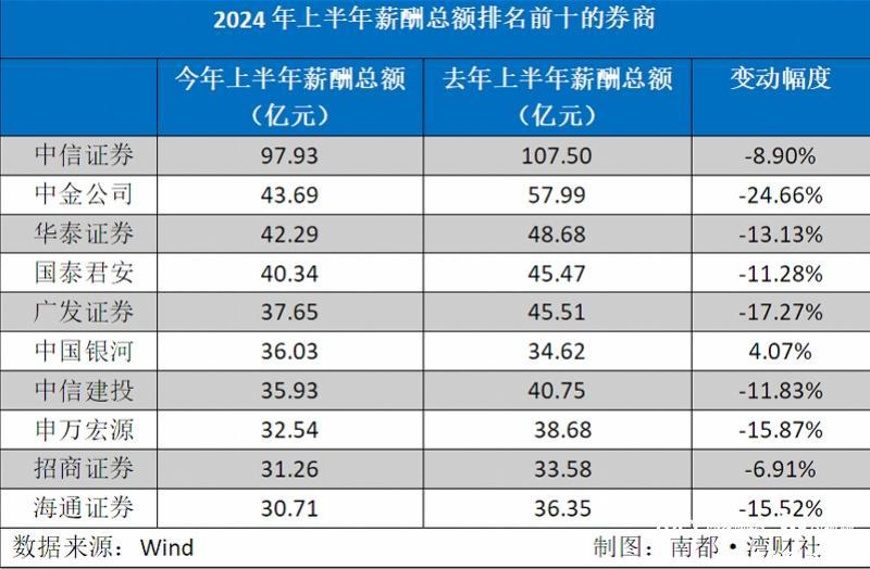 此外,上半年43家上市券商薪酬总额合计745.71亿元,较2023年上半年(848.85亿元)缩水了103.14亿元,同比减少12.15%。