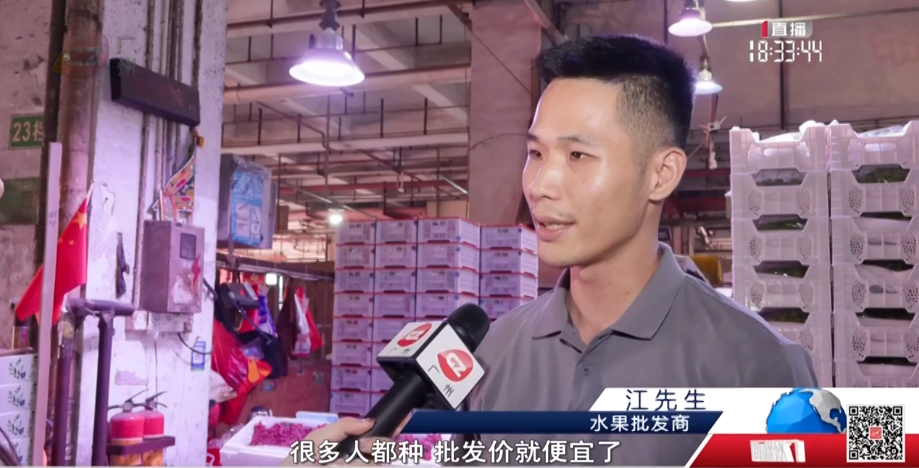水果批发商江先生:“云南、广东、湖南产地的都有,很多人都种价格就便宜了,口感逊色一点的3元、4元一斤,中等货5元、6元一斤,口感好个头大的7元、8元一斤。”