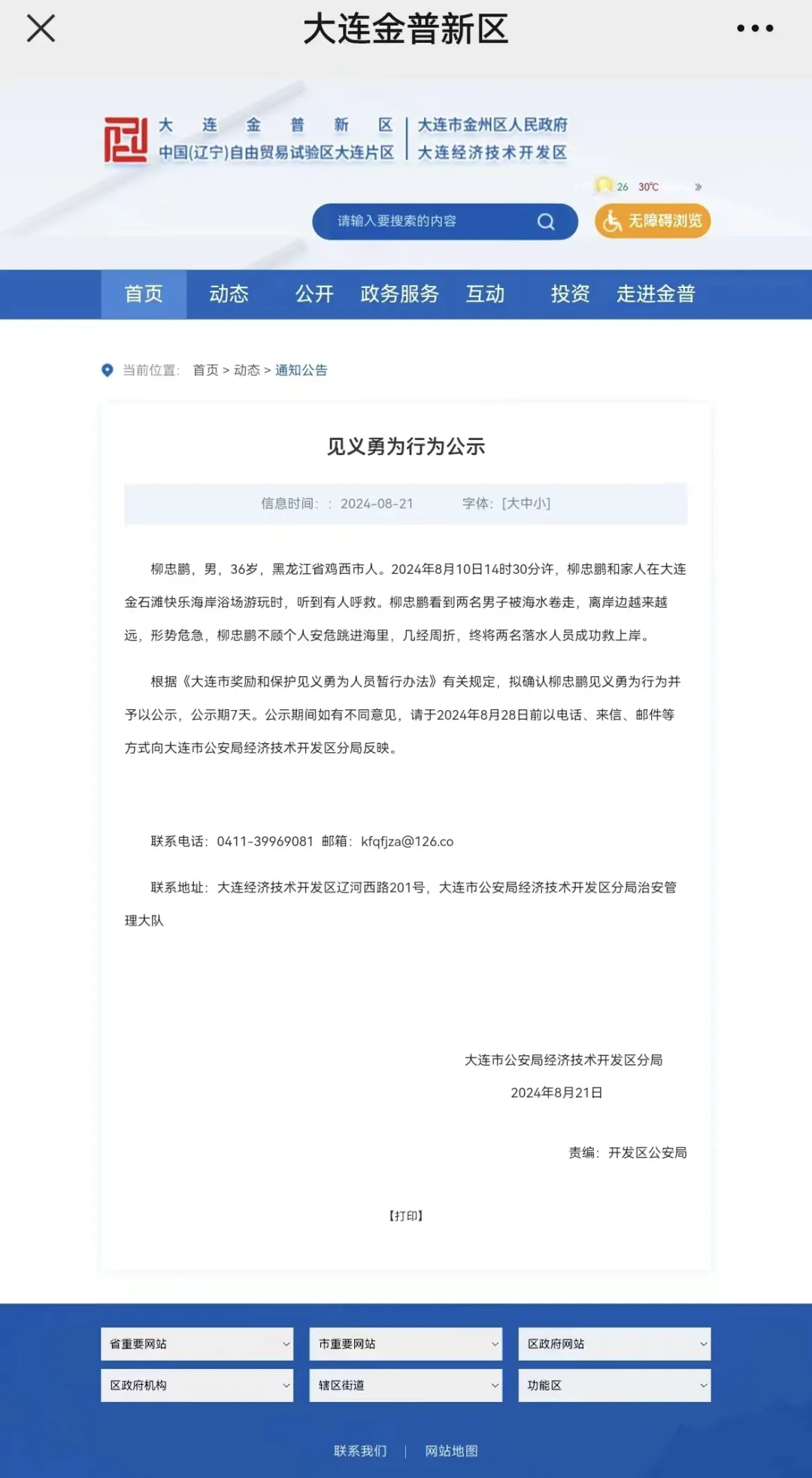 大连市公安局开发区分局治安大队见义勇为专干郑警官:事情发生后,大连市见义勇为基金会指派开发区公安分局进行属地调查,设法联系当事双方。我们了解到了当时救人的细节,帮助他准备申报材料,然而,当时的难点就是救人匆忙,谁也没有留下被救人和目击者的联系方式。随后,柳忠鹏开始通过网络平台寻人;我们也通过各种方法寻找目击者和被救人,收集视频证据。今天早上,从金石滩派出所传来好消息,被救的人主动现身,联系到了派出所。
